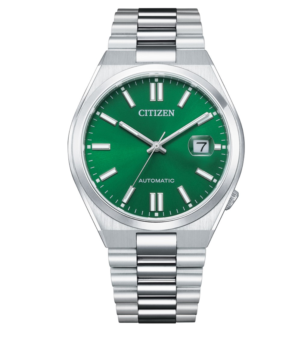 Reloj CITIZEN Movimiento Automático colección Tsuyosa. Caja y brazalete de acero. Precioso color verde en la esfera, con lumen en índices y agujas, y calendario con lupa. Por el diámetro de su caja, 40mm, lo llevará tanto él como ella. WR 50MTS.
