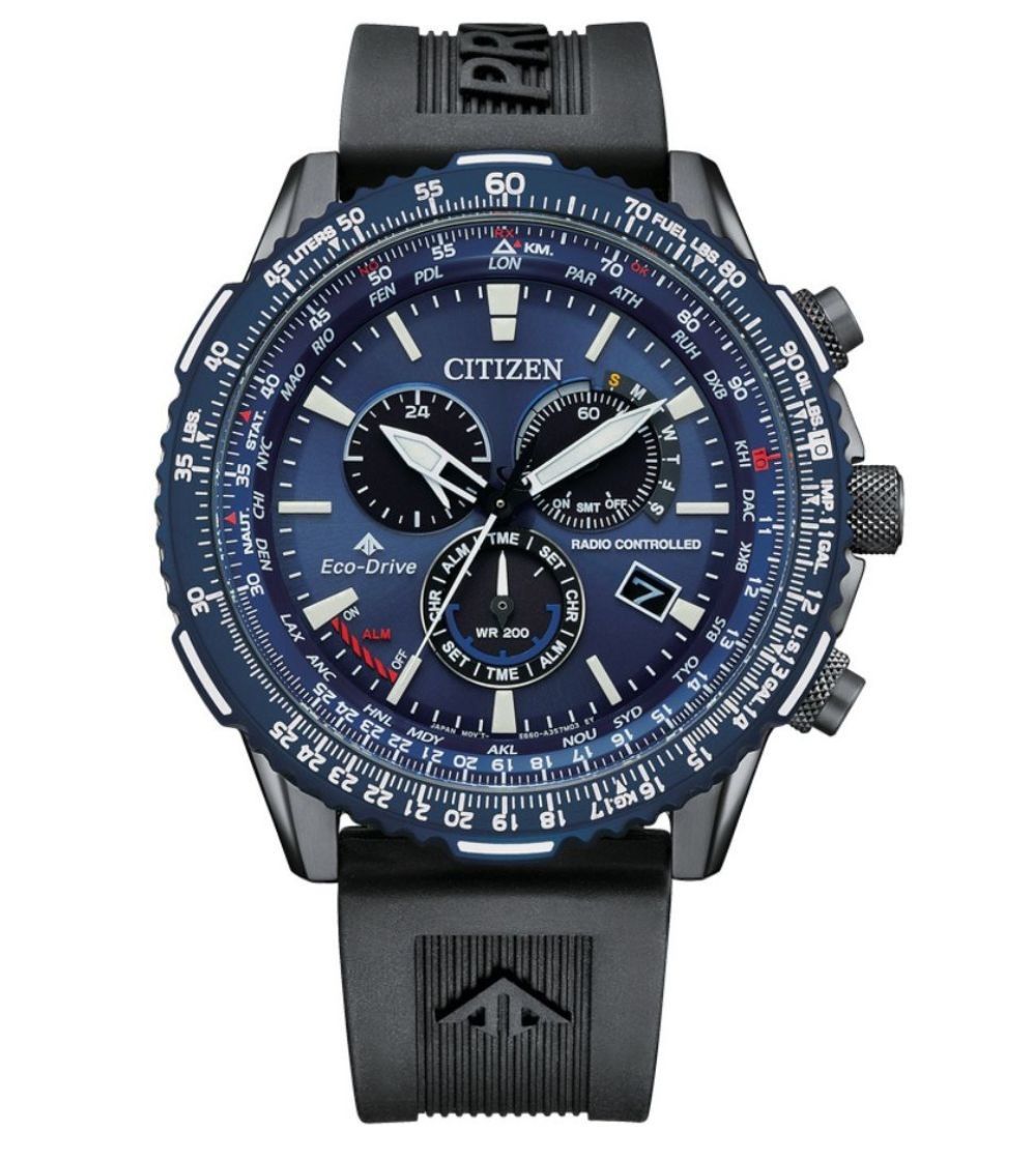 Reloj CITIZEN movimiento Eco-Drive, Radio-Controlado. Caja de acero IP Black y correa de poliuretano, con logo de CITIZEN. Cristal de zafiro con tratamiento antirreflejos. WR 20 bar.