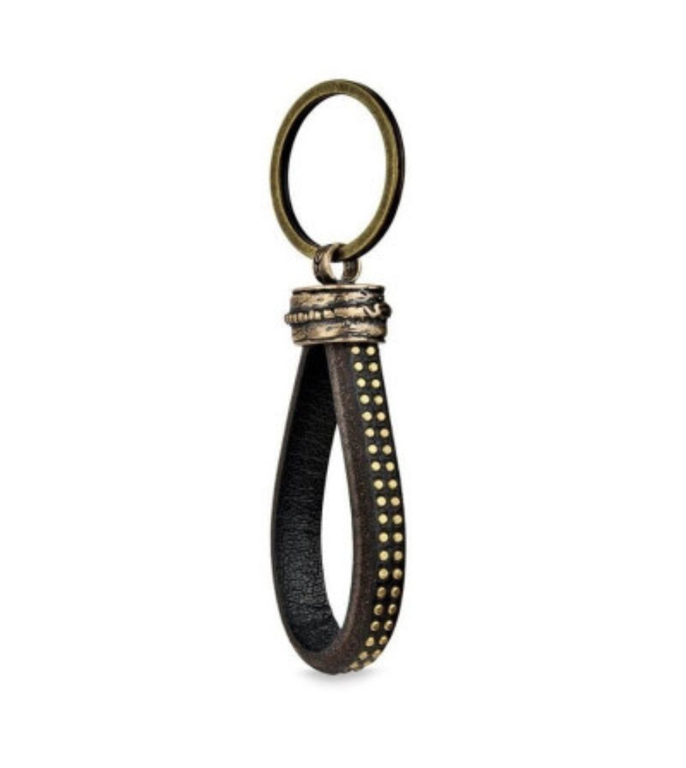 Sobrio llavero PLATADEPALO hecho en cuero y bronce. El cuero ha sido trabajado para llevar una doble hilera de tachuelas en el cuero.