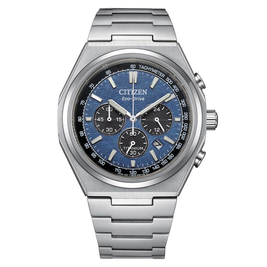 Reloj CITIZEN colección Super Titanium, material del que está hecha la caja y el brazalete. Movimiento Eco Drive B620 con reserva de carga 9 meses y cronógrafo a 1/5 segundo con contador 60 minutos. Calendario. Esfera en color azul y negro con una textura rugosa muy característica. Caja cerrada a rosca, cristal de zafiro y lumen en agujas e índices en la esfera. WR 10 bar.