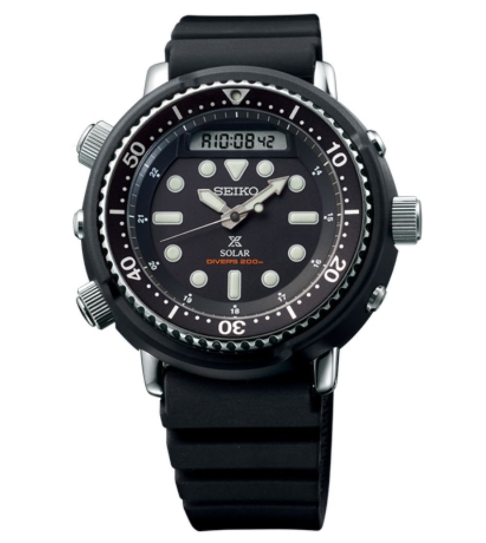 Reloj cronógrafo alógico-digital, diver 200mts, con funciones de alarma renovando el original «Arnie» de 1982. Solar, impulsado por la luz, siendo así respetuoso con el medio ambiente. Caja de acero inoxidable con protector exterior de plástico. Correa de silicona. Funciones de alarma, doble horario, aviso agotamiento de energía y prevención de sobrecarga.